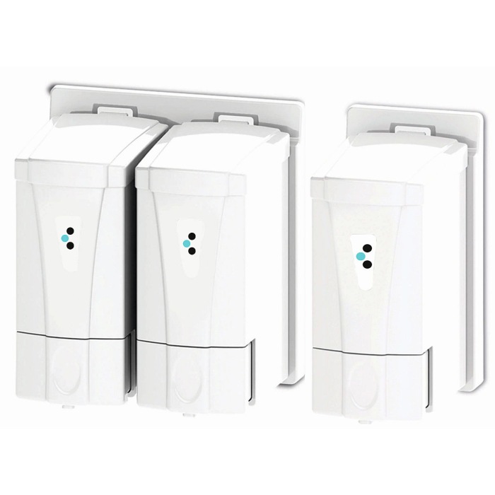 Ergonomiczny potrójny podajnik do mydła w płynie. Dozownik można stosować w układzie 2