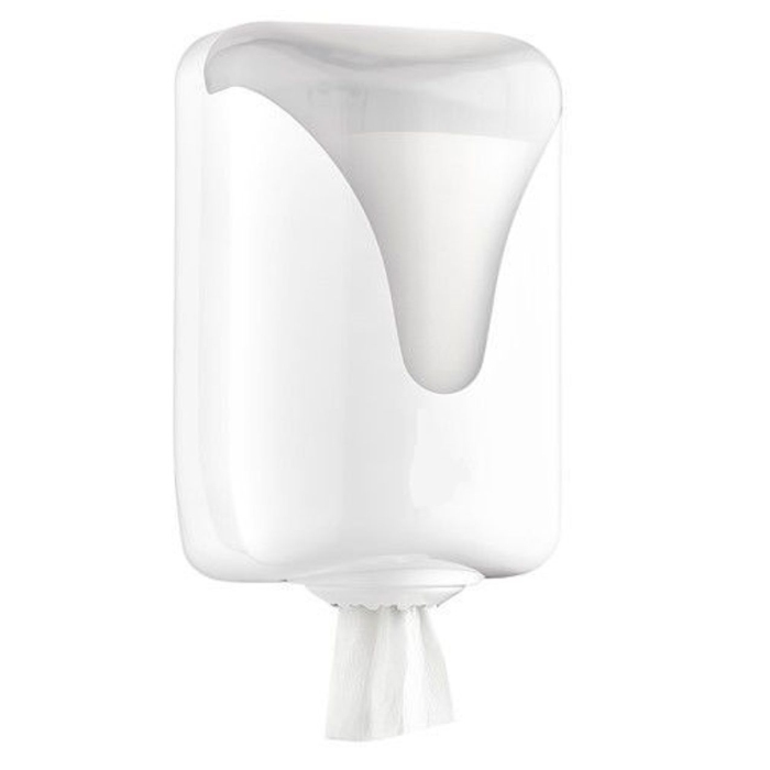Dozownik do ręczników papierowy w roli centralnego dozowania, montowany do ściany. Ręczniki w roli dozujemy w dolnym otworze podajnika. Dozownik jest wykonany z: bardzo wysokiej jakości plastik ABS. Zastosowane ręczne dozowanie ręczników powoduje że używamy tylko tyle ręczników ile potrzebujemy.